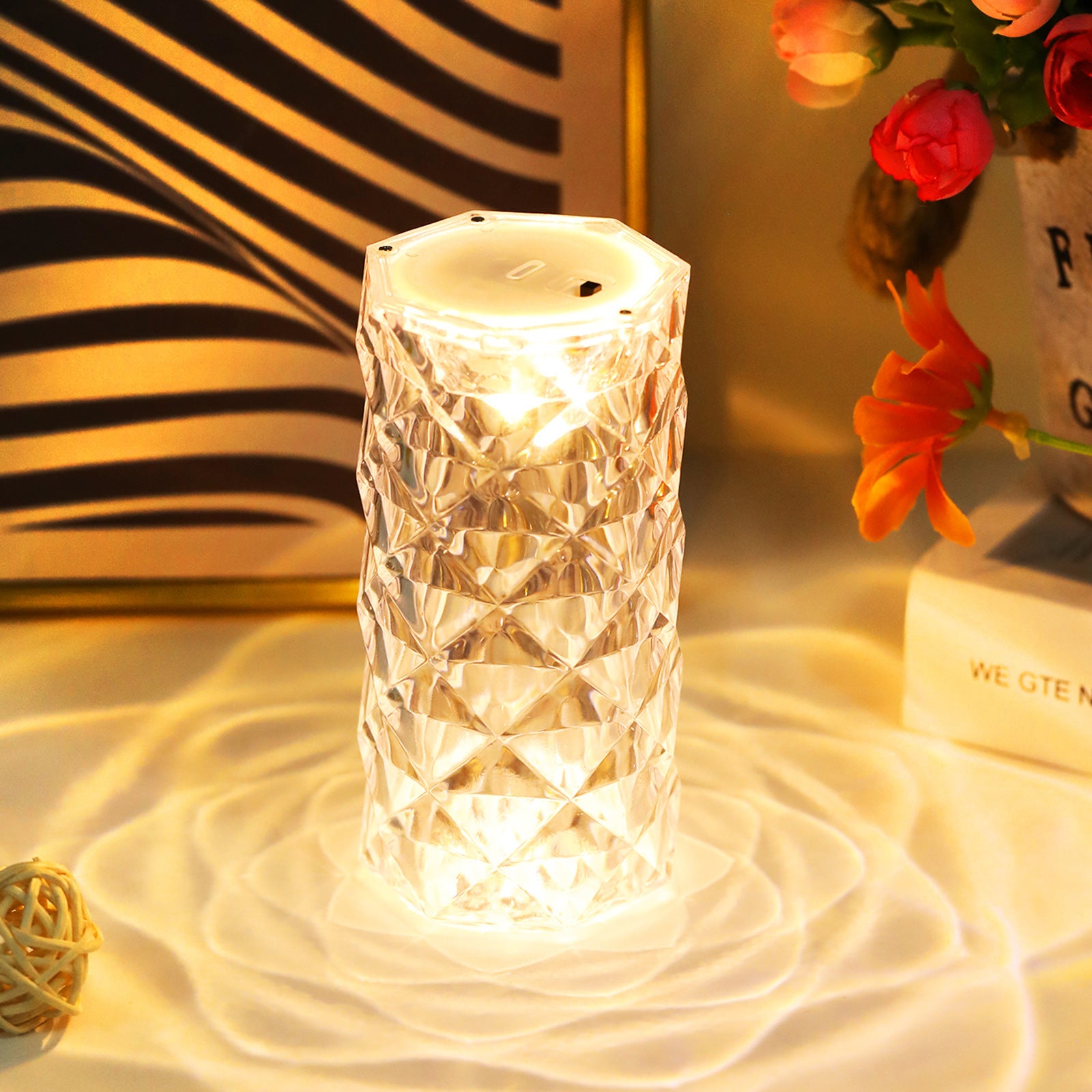 Bordlampa i klar akrylkristall med rosenblad