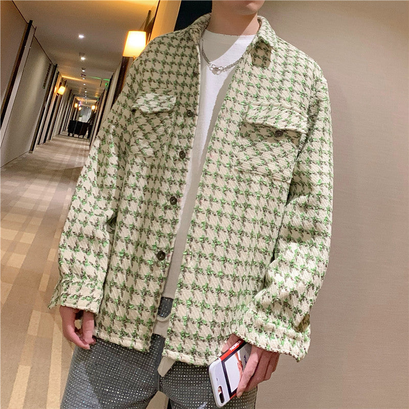 Vävd hundtandsmönstrad ullskjorta med stora fickor