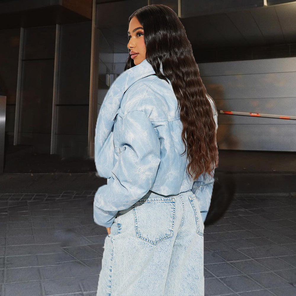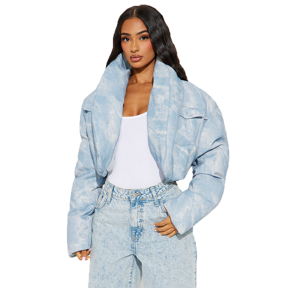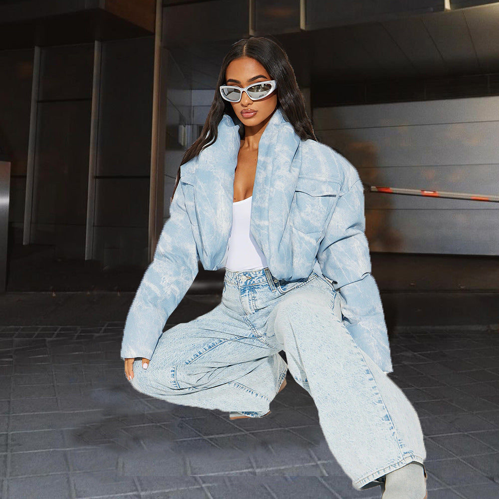 Quiltad halsduk med ståkrage, ficka, långärmad, blommig färgmatchning, kort bomullsvadderad kappa för kvinnor